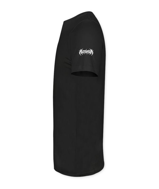 Uma criatura esquelética grotesca emerge de crânios e vermes, envolta por espinhos e correntes em um cenário sombrio. A arte transmite caos, morte e decomposição com traços intensos em preto e branco, inspirados na estética extrema e underground.